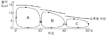 그림은 북반구의 대기 대순환을 간단히 나타낸 것이다.