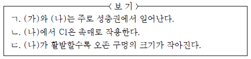 그림 (가)는 기권에서 오존(O3)이 생성되는 과정을, (나)는 CFC에 의해 오존(O3)이 파괴되는 과정을 나타낸 것이다.