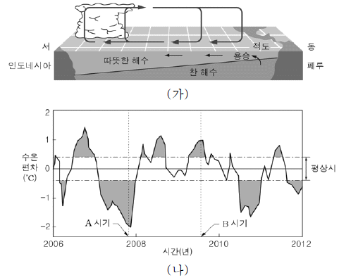 그림 (가)는 평상시 태평양 적도 부근 대기의 순환과 해수의 연직 단면을, (나)는 동태평양의 엘니뇨 감시 해역에서의 수온 편차를 나타낸 것이다.