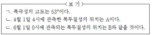 그림은 북위 37° 지역에서 어느 해 4월 1일 0시를 기준으로 4시간 전과 후에 각각 관측한 북두칠성의 위치를 나타낸 것이다.