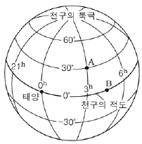 그림은 천구의에 별 A, B와 춘분날 태양의 위치를 나타낸 것이다.