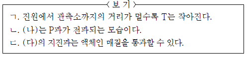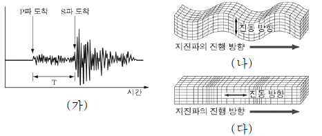 그림 (가)는 어느 지진이 발생했을 때 관측소에서 관측한 지진 기록을, (나)와 (다)는 P파와 S파가 전파되는 모습을 순서 없이 나타낸 것이다.