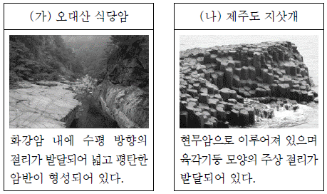 그림 (가)와 (나)는 풍화 작용에 의해 형성된 지형의 예를 나타낸 것이다.