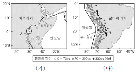 그림 (가)와 (나)는 각각 동아프리카 지역과 남아메리카 지역에 위치한 판의 경계 부근에서의 진원 분포를 나타낸 것이다.