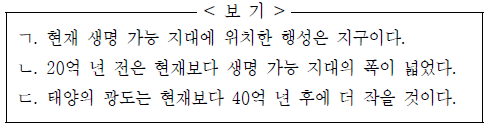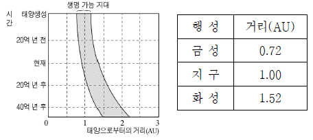 [과목 구분 없음] 그림은 태양 생성 이후 시간에 따른 생명 가능 지대의 변화를, 표는 태양과 각 행성 사이의 거리를 나타낸 것이다.