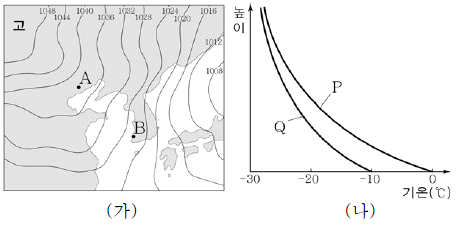 그림 (가)는 겨울철 어느 날의 일기도를, (나)는 이날 A와 B지점에서 측정한 높이에 따른 기온 분포를 나타낸 것이다.