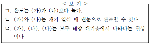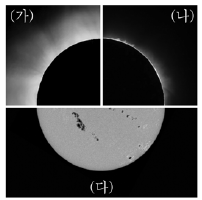 그림 (가), (나), (다)는 흑점, 채층, 코로나의 모습을 순서 없이 나타낸 것이다.