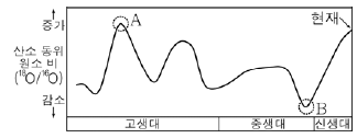 그림은 지질 시대에 따른 해양 생물 화석의 산소 동위 원소비(18O/16O)를 나타낸 것이다.