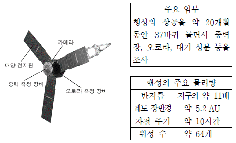 다음은 탐사선 ‘주노’의 관측 장비와 주요 임무, 탐사 대상 행성의 주요 물리량을 나타낸 것이다.