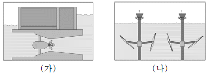 그림 (가)는 조력 발전, (나)는 조류 발전 방식을 나타낸 것이다.