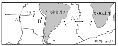 그림은 남아메리카 대륙과 아프리카 대륙 주변에서 판의 경계와 상대적인 이동 속도를 나타낸 것이다.