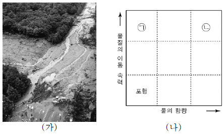 그림 (가)는 사태가 일어난 모습을, (나)는 사태를 토양 속 물의 함량과 물질의 이동 속력에 따라 구분한 것을 나타낸 것이다.