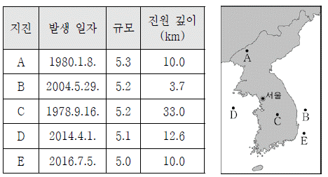 다음은 우리나라에서 관측한 지진 중 규모가 큰 지진 A ~ E의 특징과 진앙 위치를 나타낸 것이다.