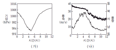 그림 (가)와 (나)는 태풍이 우리나라를 지나는 동안 어느 지점에서 관측한 기압, 풍속, 풍향을 나타낸 것이다.