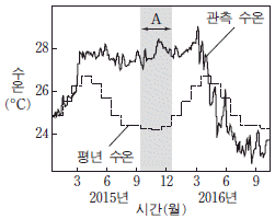 그림은 동태평양 적도 부근 해역의 관측 수온과 평년 수온을 나타낸 것이다.