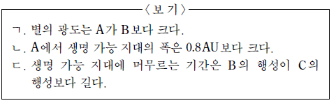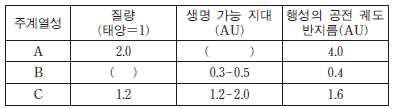 표는 주계열성 A, B, C의 질량, 생명 가능 지대, 생명 가능 지대에 위치한 행성의 공전 궤도 반지름을 나타낸 것이다.