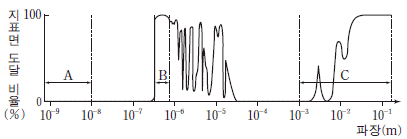 그림은 대기를 투과하여 들어오는 전자기파의 파장에 따른 지표면 도달 비율을 나타낸 것이다. A, B, C는 각각 가시광선, X선, 전파 영역 중 하나이다.