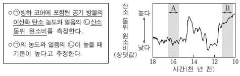다음은 빙하 코어를 이용한 고기후 연구 방법을, 그림은 그린란드 빙하 코어를 분석하여 알아낸 산소 동위 원소비를 나타낸 것이다.
