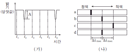 그림 (가)는 원궤도로 공전하는 어느 외계 행성에 의한 중심별의 밝기 변화를, (나)는 t1~t6 중 어느 한 시점부터 일정한 시간 간격으로 관측한 중심별의 스펙트럼을 순서대로 나타낸 것이다. Δλmax은 스펙트럼의 최대 편이량이다.