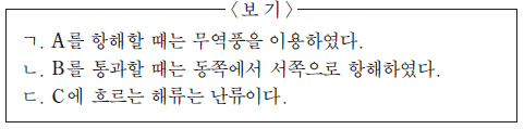 그림은 1492 ~1493 년에 콜럼버스가 바람과 해류를 이용하여 북대서양을 왕복 항해한 경로와 지점 A, B, C를 나타낸 것이다.