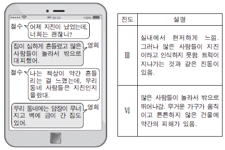 그림은 어느 지진이 발생한 다음 날 서로 다른 지역에 사는 두 사람이 주고받은 대화를, 표는 진도 계급표의 일부를 나타낸 것이다.