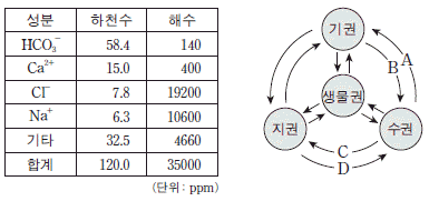 표는 하천수와 해수의 용존 물질 농도를, 그림은 지구계 구성 요소의 상호 작용을 나타낸 것이다.
