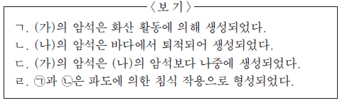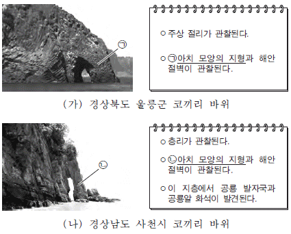 다음은 서로 다른 두 지역의 해안가에 위치한 지질 명소 (가)와 (나)를 조사하고 작성한 답사 보고서의 일부이다.