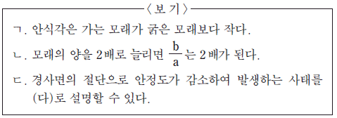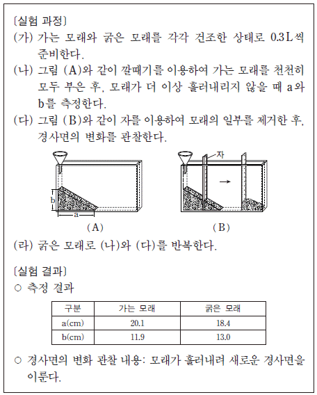 다음은 토양 입자의 크기에 따른 안식각과 경사면의 안정도 변화를 알아보기 위한 실험이다.