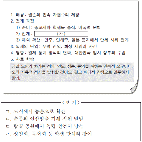 [과목 구분 없음] 다음은 어느 민족 운동에 대한 학습지이다. (가)에 들어갈 내용으로 적절한 것을 <보기>에서 고른 것은? [3점]