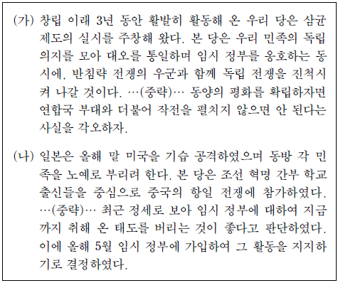 - ④ (나)를 발표한 단체는 조선 민족 전선 연맹의 창설을 주도하였을 거야.