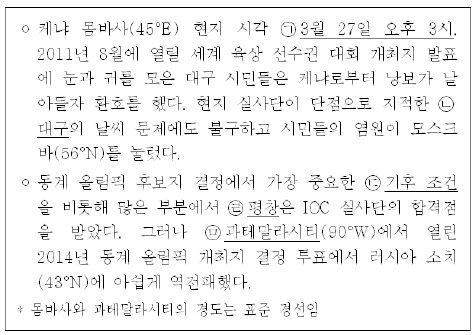 - ② ㄴ-개최 시기에는 기온이 모스크바보다 낮을 것이다.