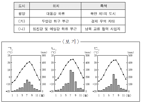 다음 자료는 북한의 세 도시에 관한 것이다. (가), (나)의 기후 그래프를 <보기>에서 골라 바르게 배열한 것은? (순서대로 가, 나)