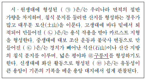 다음 글은 암석의 종류에 따른 특징적인 지형을 설명한 것이다. (ㄱ)~(ㅁ)에 대한 설명으로 옳은 것은? [3점]