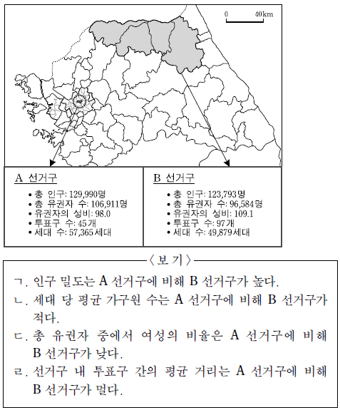 지도의 A, B 선거구 특성에 대한 옳은 설명을 <보기>에서 고른 것은? [3점]