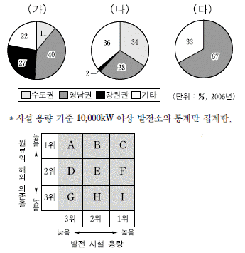 (가)~(다)는 우리나라 전력 발전 양식에 따른 지역별 비중을 나타낸 것이다. 발전 양식의 순위를 그림에서 찾아 순서대로 바르게 배열한 것은? (순서대로 가, 나, 다) [3점]