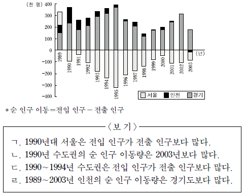 그래프는 수도권의 순 인구 이동 변화를 나타낸 것이다. 이에 대한 옳은 설명을 <보기>에서 고른 것은?