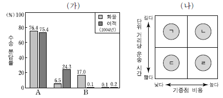 (가)는 국내의 운송 수단별 수송 분담률을 나타낸 것이다. A와 B의 일반적인 특징을 (나)에서 골라 순서대로 바르게 배열 한 것은? (단, 여객은 수송 인원, 화물은 수송 톤 수를 기준으로 하며, 철도는 지하철을 포함함.) (순서대로 A, B)