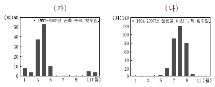그래프는 우리나라의 어떤 기후 현상에 관한 것이다. (가), (나)에 대한 내용으로 옳은 것은? [3점]