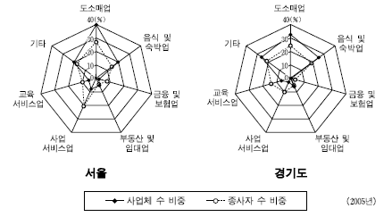 다음 자료는 두 지역의 서비스 산업 구조를 나타낸 것이다. 이에 대한 분석으로 옳지 않은 것은? [3점]