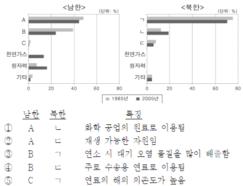 그래프는 남한과 북한의 1차 에너지 소비 구성비 변화를 나타낸 것이다. 관련 있는 것끼리 바르게 연결한 것은? [3점]