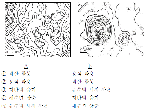 A와 B 지형의 형성 원인이 바르게 연결된 것은? [3점]