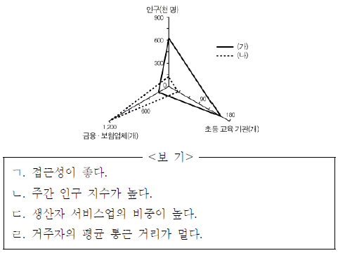 그래프는 어느 대도시의 두 구(區)에 대한 것이다. (가)에 비해 (나)에서 뚜렷하게 나타나는 특성으로 옳은 것만을 <보기>에서 있는 대로 고른 것은?