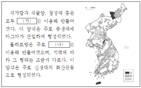 (가), (나)에 들어갈 암석이 주로 분포하는 지역을 지도의 A~C에서 고른 것은? (순서대로 가, 나) [3점]