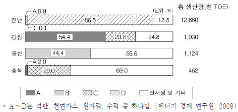 그래프는 지역별 1차 에너지 생산 현황을 나타낸 것이다. A~D자원에 대한 설명으로 옳은 것은? [3점]