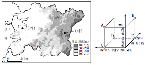 [과목 구분 없음] 지도는 전라북도의 해발 고도 분포를 나타낸 것이다. (가)와 비교한 (나)의 상대적 특징으로 옳은 것을 그래프에서 고른 것은? [3점]
