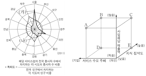 [과목 구분 없음] 그래프는 두 서비스업의 시도별 특화도이다. (나)와 비교한 (가)의 상대적 특성을 그림의 A~E에서 고른 것은? (단, (가), (나)는 전문ㆍ과학ㆍ기술 서비스업과 숙박ㆍ음식점업 중 하나임.)[3점]