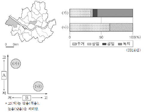 그래프는 지도에 표시된 두 구(區)의 용도 지역별 면적 비중을 나타낸 것이다. (가), (나) 구의 상대적 특징을 그림과 같이 비교할 때 A, B에 들어갈 내용으로 옳은 것은? (순서대로 A, B) [3점]