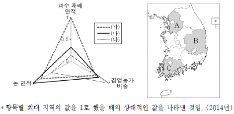 그래프의 (가)~(다)에 해당하는 지역을 지도의 A ~ C에서 고른 것은? (순서대로 가, 나, 다)
