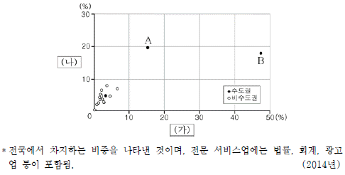 그래프는 (가), (나) 서비스업의 시ㆍ도별 사업체 수 비중을 나타낸 것이다. 이에 대한 설명으로 옳은 것은? (단, (가), (나)는 숙박 및 음식점업, 전문 서비스업 중의 하나임.) [3점]