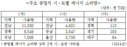 표의 (가)~(다) 공업에 대한 설명으로 옳지 않은 것은? (단, (가)~(다)는 1차 금속, 섬유 제품(의복 제외), 화학 물질 및 화학 제품(의약품 제외) 제조업 중 하나임.)